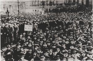 Reprint einer Schwarzweiß-Fotografie von 1918 aus dem Zentralarchiv IG Metall, als Postkarte des Deutschen Metallarbeiter-Verbandes. Zu sehen sind Teilnehmer*innen einer Demonstration in Berlin mit Transparenten "Die ganze Macht an die Arbeiter- und Soldatenräte.", während der sog. Novemberrevolution. Quelle: Zentralarchiv IG Metall