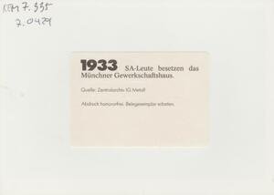 1933, Postkarte des Deutschen Metallarbeiter-Verbandes. Schwarzweiß. Reprint einer Fotografie aus dem Zentralarchiv IG Metall. SA-Leute besetzen das Münchner Gewerkschaftshaus. Quelle: Zentralarchiv IG Metall