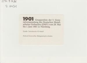 1901, Postkarte des Deutschen Metallarbeiter-Verbandes. Schwarzweiß. Reprint einer Fotografie aus dem Zentralarchiv IG Metall. Gruppenfoto der 5. Generalversammlung des Deutschen Metallarbeiter-Verbandes (DMV) vom 28. Mai bis 1. Juni 1901 in Nürnberg. Quelle: Zentralarchiv IG Metall