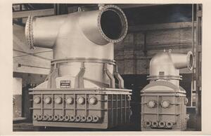 Schwarzweißfotografie. Luftaufnahme der Firma Feld & Hahn in Bendorf. Hinter Feldern ist in der Bildmitte das Werksgelände der Firma Feld & Hahn zu sehen. Im Hintergrund ist die Concordia-Hütte mit den darüber liegenden Schlackenhalden abgebildet. Diese wurden von einer holländischen Firma gekauft, abgetragen und für den Autobahnbau als Untergrund verwendet. 1894 gründete der Ingenieur Ernst Feld eine Firma zur Herstellung von Kleingewerbekesseln und Rohrleitungen. 1896 übernahm Feld die Kesselschmiede von Johann Reuber. Den größten Erfolg feierte die Firma mit der Entwicklung von Eindampfapparaten, mit denen man die Abwässer der Seifenherstellung destillieren und dadurch wertvolles Glycerin herstellen konnte. Die Firma war schwerpunktmäßig im Apparatebau für die Großchemie tätig. Durch die Forschungen des Bruder von Hans Feld, Walter Feld, konnten viele Patente entwickelt werden. 1902 trat der Ingenieur Adrianus G. L. Vorstmann als Teilhaber in die Firma ein. Die Firma nannte sich fortan „Feld & Vorstmann GmbH“. Nach dessen Tod am 5.11.1927 übernahm Sohn Fritz Vorstmann die Position des Vaters. Während der Wirtschaftskrise der 1928-1930er Jahre geriet die Firma in finanzielle Schwierigkeiten. Der Ingenieur Josef Hahn trat als Teilhaber und Geldgeber in die Firma ein, die nun unter dem Namen „Feld & Hahn GmbH. Fabrik für Apparate- und Dampfkesselbau firmierte.