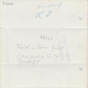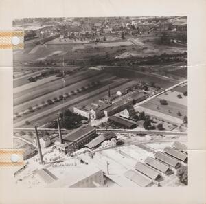 Schwarzweißfotografie. Luftaufnahme der Firma Feld & Hahn in Bendorf. 1894 gründete der Ingenieur Ernst Feld eine Firma zur Herstellung von Kleingewerbekesseln und Rohrleitungen. 1896 übernahm Feld die Kesselschmiede von Johann Reuber. Den größten Erfolg feierte die Firma mit der Entwicklung von Eindampfapparaten, mit denen man die Abwässer der Seifenherstellung destillieren und dadurch wertvolles Glycerin herstellen konnte. Die Firma war schwerpunktmäßig im Apparatebau für die Großchemie tätig. Durch die Forschungen des Bruder von Hans Feld, Walter Feld, konnten viele Patente entwickelt werden. 1902 trat der Ingenieur Adrianus G. L. Vorstmann als Teilhaber in die Firma ein. Die Firma nannte sich fortan „Feld & Vorstmann GmbH“. Nach dessen Tod am 5.11.1927 übernahm Sohn Fritz Vorstmann die Position des Vaters. Während der Wirtschaftskrise der 1928-1930er Jahre geriet die Firma in finanzielle Schwierigkeiten. Der Ingenieur Josef Hahn trat als Teilhaber und Geldgeber in die Firma ein, die nun unter dem Namen „Feld & Hahn GmbH. Fabrik für Apparate- und Dampfkesselbau firmierte.