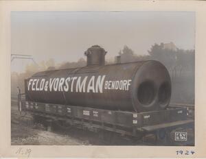 Schwarzweißfotografie mit Retusche. Die Aufnahme von 1924 zeigt einen Dampfkessel auf einem Güterwagon. Der Kessel ist beschriftet mit "FELD & VORSTMAN BENDORF". 1894 gründete der Ingenieur Ernst Feld eine Firma zur Herstellung von Kleingewerbekesseln und Rohrleitungen. 1896 übernahm Feld die Kesselschmiede von Johann Reuber. Den größten Erfolg feierte die Firma mit der Entwicklung von Eindampfapparaten, mit denen man die Abwässer der Seifenherstellung destillieren und dadurch wertvolles Glycerin herstellen konnte. Die Firma war schwerpunktmäßig im Apparatebau für die Großchemie tätig. Durch die Forschungen des Bruder von Hans Feld, Walter Feld, konnten viele Patente entwickelt werden. 1902 trat der Ingenieur Adrianus G. L. Vorstmann als Teilhaber in die Firma ein. Die Firma nannte sich fortan „Feld & Vorstmann GmbH“. Nach dessen Tod am 5.11.1927 übernahm Sohn Fritz Vorstmann die Position des Vaters. Während der Wirtschaftskrise der 1928-1930er Jahre geriet die Firma in finanzielle Schwierigkeiten. Der Ingenieur Josef Hahn trat als Teilhaber und Geldgeber in die Firma ein, die nun unter dem Namen „Feld & Hahn GmbH. Fabrik für Apparate- und Dampfkesselbau firmierte.