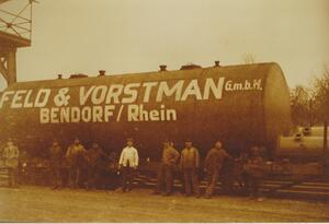 Schwarzweißfotografie aus der Sammlung "Zeitgeschichte der Firma Feld & Hahn" von Hans Hagen, Bendorf. Die Aufnahme zeigt einige Arbeiter vor einem Güterwagen mit einem großen Kessel, der die Aufschrift "FELD & VORSTMAN GmBH BENDORF / Rhein" trägt. Das Foto entstand um 1925. 1894 gründete der Ingenieur Ernst Feld eine Firma zur Herstellung von Kleingewerbekesseln und Rohrleitungen. 1896 übernahm Feld die Kesselschmiede von Johann Reuber. Den größten Erfolg feierte die Firma mit der Entwicklung von Eindampfapparaten, mit denen man die Abwässer der Seifenherstellung destillieren und dadurch wertvolles Glycerin herstellen konnte. Die Firma war schwerpunktmäßig im Apparatebau für die Großchemie tätig. Durch die Forschungen des Bruder von Hans Feld, Walter Feld, konnten viele Patente entwickelt werden. 1902 trat der Ingenieur Adrianus G. L. Vorstmann als Teilhaber in die Firma ein. Die Firma nannte sich fortan „Feld & Vorstmann GmbH“. Nach dessen Tod am 5.11.1927 übernahm Sohn Fritz Vorstmann die Position des Vaters. Während der Wirtschaftskrise der 1928-1930er Jahre geriet die Firma in finanzielle Schwierigkeiten. Der Ingenieur Josef Hahn trat als Teilhaber und Geldgeber in die Firma ein, die nun unter dem Namen „Feld & Hahn GmbH. Fabrik für Apparate- und Dampfkesselbau firmierte.