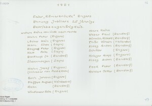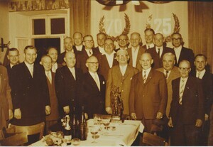 Schwarzweißfotografie aus der Sammlung "Zeitgeschichte der Firma Feld & Hahn" von Hans Hagen, Bendorf. Das Foto entstand 1961 anlässlich Ehrung zum 25-jährigen Dienstjubiläum von Mitarbeitern der Firma Feld & Hahn in der früheren Gaststätte "Römerbrücke" in Engers. Untere Reihe von links nach rechts: Hahn Peter (Engers) Löcher Hein (Engers) Horn Simon (Sayn) Bongars Peter (Engers) Nett Fritz (Sayn) Backhuys Jo (Bendorf) Siebenmorgen (Sayn) Hahn Josef (Engers), Inhaber von Feld & Hahn Esch Johann (Engers) Meffert August (Heimbach-Weiß) Kahn (Bendorf) Windheuser Fritz (Engers) Obere Reihe: Weber Paul (Bendorf) Himrich Richard (Bendorf) Thür Wilhelm (Vallendar) Moog Anton (Bendorf) Schüller (Engers) Krieger Aloys (Engers) Moog Anton (Bendorf) Pook Peter (Bendorf) Kahlert Oskar (Bendorf)