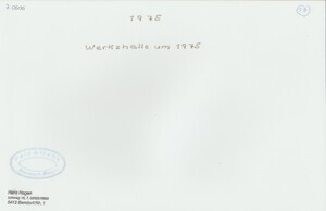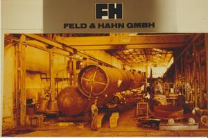 Farbfotografie aus der Sammlung "Zeitgeschichte der Firma Feld & Hahn" von Hans Hagen, Bendorf. Die Aufnahme zeigt ein Foto, auf dem der Blick in eine Werkshalle der Firma Feld & Hahn abgebildet ist (1975). 1894 gründete der Ingenieur Ernst Feld eine Firma zur Herstellung von Kleingewerbekesseln und Rohrleitungen. 1896 übernahm Feld die Kesselschmiede von Johann Reuber. Den größten Erfolg feierte die Firma mit der Entwicklung von Eindampfapparaten, mit denen man die Abwässer der Seifenherstellung destillieren und dadurch wertvolles Glycerin herstellen konnte. Die Firma war schwerpunktmäßig im Apparatebau für die Großchemie tätig. Durch die Forschungen des Bruder von Hans Feld, Walter Feld, konnten viele Patente entwickelt werden. 1902 trat der Ingenieur Adrianus G. L. Vorstmann als Teilhaber in die Firma ein. Die Firma nannte sich fortan „Feld & Vorstmann GmbH“. Nach dessen Tod am 5.11.1927 übernahm Sohn Fritz Vorstmann die Position des Vaters. Während der Wirtschaftskrise der 1928-1930er Jahre geriet die Firma in finanzielle Schwierigkeiten. Der Ingenieur Josef Hahn trat als Teilhaber und Geldgeber in die Firma ein, die nun unter dem Namen „Feld & Hahn GmbH. Fabrik für Apparate- und Dampfkesselbau firmierte.