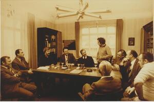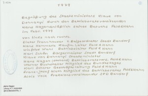 Schwarzweißfotografie aus der Sammlung "Zeitgeschichte der Firma Feld & Hahn" von Hans Hagen, Bendorf. Das Foto entstand im Februar 1979, während der Begrüßung des Staatsministers Klaus von Dohnanyi durch den Betriebsratsvorsitzenden Hans Hagen anlässlich seines Besuches bei Feld & Hahn. von links nach rechts: Dieter Trennheuser, 1. Beigeordneter der Stadt Bendorf Hans Hemmerle, kaufm. Leiter Feld & Hahn Winfried Wahl, Betriebsleiter Feld & Hahn Karl Schön, Bürgermeister Stadt Bendorf Klaus von Dohnanyi, Staatsminister Hans Hagen (stehend), Betriebsratsvorsitzender Feld & Hahn Werner Buchstaller, Mitglied des Bundestages Karl Scherer, Geschäftsleitung Feld & Hahn Franz-Josef Nieth, Mitglied des Betriebsrates Feld & Hahn Alois Volk, Fraktionsvorsitzender SPD Bendorf 1894 gründete der Ingenieur Ernst Feld eine Firma zur Herstellung von Kleingewerbekesseln und Rohrleitungen. 1896 übernahm Feld die Kesselschmiede von Johann Reuber. Den größten Erfolg feierte die Firma mit der Entwicklung von Eindampfapparaten, mit denen man die Abwässer der Seifenherstellung destillieren und dadurch wertvolles Glycerin herstellen konnte. Die Firma war schwerpunktmäßig im Apparatebau für die Großchemie tätig. Durch die Forschungen des Bruder von Hans Feld, Walter Feld, konnten viele Patente entwickelt werden. 1902 trat der Ingenieur Adrianus G. L. Vorstmann als Teilhaber in die Firma ein. Die Firma nannte sich fortan „Feld & Vorstmann GmbH“. Nach dessen Tod am 5.11.1927 übernahm Sohn Fritz Vorstmann die Position des Vaters. Während der Wirtschaftskrise der 1928-1930er Jahre geriet die Firma in finanzielle Schwierigkeiten. Der Ingenieur Josef Hahn trat als Teilhaber und Geldgeber in die Firma ein, die nun unter dem Namen „Feld & Hahn GmbH. Fabrik für Apparate- und Dampfkesselbau firmierte.