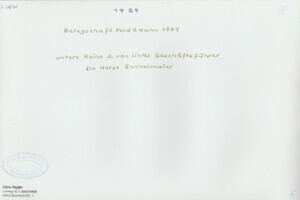 Die Schwarzweißfotografie zeigt die Belegschaft der Firma "Feld & Hahn - Apparatebau" in Bendorf 1969. In der ersten Reihe 3. von links ist Geschäftsführer Dr. Horst Enchelmeyer. 1894 gründete der Ingenieur Ernst Feld eine Firma zur Herstellung von Kleingewerbekesseln und Rohrleitungen. 1896 übernahm Feld die Kesselschmiede von Johann Reuber. Den größten Erfolg feierte die Firma mit der Entwicklung von Eindampfapparaten, mit denen man die Abwässer der Seifenherstellung destillieren und dadurch wertvolles Glycerin herstellen konnte. Die Firma war schwerpunktmäßig im Apparatebau für die Großchemie tätig. Durch die Forschungen des Bruder von Hans Feld, Walter Feld, konnten viele Patente entwickelt werden. 1902 trat der Ingenieur Adrianus G. L. Vorstmann als Teilhaber in die Firma ein. Die Firma nannte sich fortan „Feld & Vorstmann GmbH“. Nach dessen Tod am 5.11.1927 übernahm Sohn Fritz Vorstmann die Position des Vaters. Während der Wirtschaftskrise der 1928-1930er Jahre geriet die Firma in finanzielle Schwierigkeiten. Der Ingenieur Josef Hahn trat als Teilhaber und Geldgeber in die Firma ein, die nun unter dem Namen „Feld & Hahn GmbH. Fabrik für Apparate- und Dampfkesselbau firmierte.