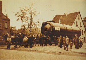 Schwarzweißfotografie. Verladen und Transport eines großen Behälters der Firma Feld & Hahn (Ecke Haupt-Poststrasse) 1932. Zu sehen ist der eisenbereifte hölzerne Transportwagen mit 5 vorgespannten Pferden, in Begleitung von Arbeitern und der Polizei. Der große Behälter bzw. Kessel ist bereits aufgeladen. Auch Passanten schauen bei dem Transport zu. Ursprünglich gehörte der Wagen mit einer Breite von 2 Metern und einer Länge von 7 Metern und zum Inventar der Sayner Hütte. Vor Schließung der Hütte im Jahre 1926 , wurde der Transportwagen 1924 an die Firma Feld & Vorstmann verkauft. Die eisenbeschlagenen Rädern waren 22 cm breit und jedes einzelne Rad verfügte über eine eigene Bremse, die von Hand bedient wurde. 1894 gründete der Ingenieur Ernst Feld eine Firma zur Herstellung von Kleingewerbekesseln und Rohrleitungen. 1896 übernahm Feld die Kesselschmiede von Johann Reuber. Den größten Erfolg feierte die Firma mit der Entwicklung von Eindampfapparaten, mit denen man die Abwässer der Seifenherstellung destillieren und dadurch wertvolles Glycerin herstellen konnte. Die Firma war schwerpunktmäßig im Apparatebau für die Großchemie tätig. Durch die Forschungen des Bruder von Hans Feld, Walter Feld, konnten viele Patente entwickelt werden. 1902 trat der Ingenieur Adrianus G. L. Vorstmann als Teilhaber in die Firma ein. Die Firma nannte sich fortan „Feld & Vorstmann GmbH“. Nach dessen Tod am 5.11.1927 übernahm Sohn Fritz Vorstmann die Position des Vaters. Während der Wirtschaftskrise der 1928-1930er Jahre geriet die Firma in finanzielle Schwierigkeiten. Der Ingenieur Josef Hahn trat als Teilhaber und Geldgeber in die Firma ein, die nun unter dem Namen „Feld & Hahn GmbH. Fabrik für Apparate- und Dampfkesselbau firmierte.