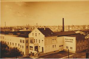 Schwarzweißfotografie der früher in Bendorf ansässigen Firma Feld & Hahn. Es handelt sich um eine Außenansicht mit Bürogebäude aus dem Jahre 1965. 1894 gründete der Ingenieur Ernst Feld eine Firma zur Herstellung von Kleingewerbekesseln und Rohrleitungen. 1896 übernahm Feld die Kesselschmiede von Johann Reuber. Den größten Erfolg feierte die Firma mit der Entwicklung von Eindampfapparaten, mit denen man die Abwässer der Seifenherstellung destillieren und dadurch wertvolles Glycerin herstellen konnte. Die Firma war schwerpunktmäßig im Apparatebau für die Großchemie tätig. Durch die Forschungen des Bruder von Hans Feld, Walter Feld, konnten viele Patente entwickelt werden. 1902 trat der Ingenieur Adrianus G. L. Vorstmann als Teilhaber in die Firma ein. Die Firma nannte sich fortan „Feld & Vorstmann GmbH“. Nach dessen Tod am 5.11.1927 übernahm Sohn Fritz Vorstmann die Position des Vaters. Während der Wirtschaftskrise der 1928-1930er Jahre geriet die Firma in finanzielle Schwierigkeiten. Der Ingenieur Josef Hahn trat als Teilhaber und Geldgeber in die Firma ein, die nun unter dem Namen „Feld & Hahn GmbH. Fabrik für Apparate- und Dampfkesselbau firmierte.