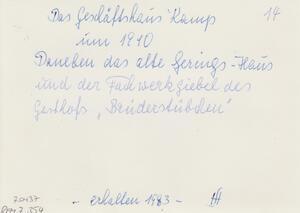 Schwarzweißfotografie. Zu sehen ist das ehemalige Geschäftshaus für Eisenwaren, Haushalts- und Küchengeräte "Heinrich Kamp" um 1910 in der Bachstrasse in Bendorf. Das Foto diente auch als Postkartenmotiv. Beschriftung oben: "Gruss aus Bendorf a. Rh. Bachstrasse".