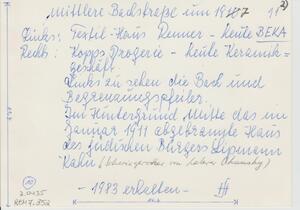 Schwarzweißfotografie. Die Aufnahme bzw. Postkarte zeigt den Blick von der Hauptstraße in Bendorf Richtung "Untere Bachstraße" um 1907. Dabei stehen einige Passanten im Vordergrund und schauen Richtung Fotograf. Vorne links ist das Geschäfts- bzw. Textil-Haus "W. Renner" (später BEKA) und rechts an der Ecke die "Drogen-, Chemikalien, Material & Farbwaren"-Handlung W. Kopp" zu erkennen. In Hintergrund Mitte das im Januar 1911 abgebrannte Haus des jüdischen Bürgers Lippmann Kahn.