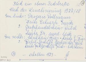 Schwarzweißfotografie. Die Aufnahme bzw. Postkarte zeigt den Blick von der Bergstraße in die Obere Bachstraße in Bendorf nach der Kanalisierung 1927/28. Auf der linken Seite befand sich die ehemalige Drogerie Pothmann und daneben das Handelshaus Pulch, heute Arztpraxis Dr. med. Nick. Auf der rechten Seite sind das ehemalige Schuhhaus Fries, daneben Textil-Geschäft Geschwister Feist (später Fachgeschäft Fuchs-Eckstein) zu erkennen.