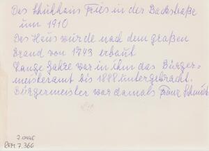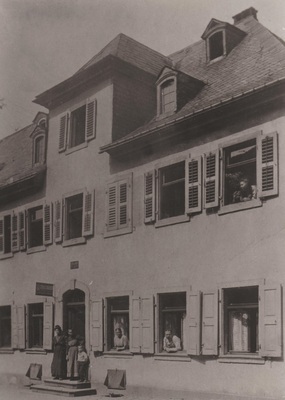 Schwarzweißfotografie. Die Aufnahme um 1910 zeigt das Haus Fries in der Oberen Bachstraße in Bendorf. Das Haus wurde um 1750 erbaut von der Familie Remy. Von 1880 bis 1888 war dort das Bürgermeisteramt untergebracht.
