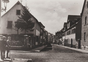 Schwarzweißfotografie. Blick von der Bergstraße in die Obere Bachstraße in Bendorf um 1930. Links ist das Geschäftshaus Mangner, später Wolf-Hollinghausen zu erkennen.