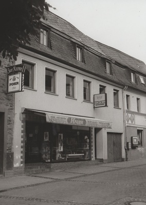 Schwarzweißfotografie. Die Aufnahme zeigt das Gebäude mit dem ehemaligen Ladenlokal der Bäckerei Krause in der Unteren Bachstraße in Bendorf, gleich neben dem ehemaligen Gasthaus "Zur Krone".