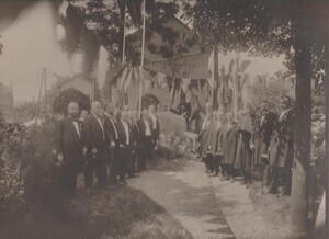 Schwarzweißfotografie. Einweihung des Gedenksteines zum Anlass des 25-jährigen Jubiläums der Regierung Kaiser Wilhelms II. am 11. August 1913 am Spitzchen, Ecke Hauptstraße - Untere Vallendarer Straße. Der Stein ist nach dem Krieg in den 50er Jahren abgebaut worden. Auf dem Bild zu sehen sind Bendorfer Bürger und Vereinsabordnungen mit ihren Fahnen sowie zahlreiche Zuschauer. Erster von links: Lehrer Josef Hardt Dritter von rechts: Pfarrer Dr. Josef Rickel Fünfter von rechts, erste Reihe: Heinrich Kamp