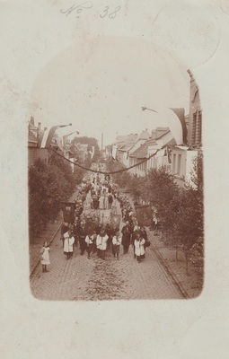 Schwarzweißfotografie als Postkarte. Die Postkarte adressiert an Josef Malkmus 1909, zeigt eine Prozession durch die Innenstadt.