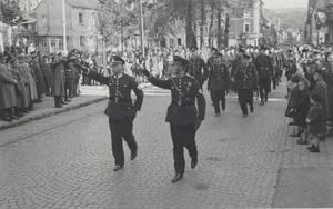 Schwarzweißfotografie. Auf dem Bild sind uniformierte Männer beim Marschieren durch die Bendorfer Innenstadt (Hauptstraße), während der Zeit des Nationalsozialismus zu sehen.