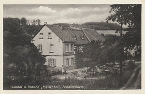 Schwarzweißdruck, Postkarte. Die Postkarte zeigt den außerhalb von Bendorf in Waldnähe gelegenen Gasthof "Meisenhof" mit Biergarten. Die Waldgaststätte Meisenhof besteht heute noch. Das Gebäude gehört Hubert Frenchkowski und ist verpachtet.
