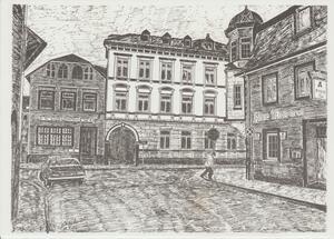Schwarzweiß Federzeichnung von Georg Raber als Postkarte gedruckt. Diese Zeichnung zeigt die frühere Gaststätte Bendorfer Hof in der Unteren Vallendarer Straße Ecke Bachstraße in Bendorf. Heute befindet sich dort ein Geschäftsgebäude mit Passage "Im Flegge".
