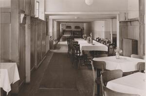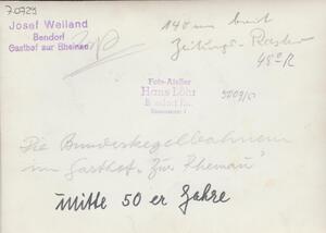 Schwarweißfotografie. Das Bild zeigt eine Innenaufnahme von einem Gastraum mit Bundeskegelbahn im Gasthof "Zur Rheinau" in Bendorf, Mitte der 1950er Jahre. Das Fotoatelier Hans Löhr in Bendorf am Engersport war für die Aufnahme verantwortlich. Der Gasthof wurde von der Familie Metternich geführt.