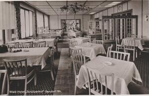 Schwarzweiß-Postkarte. Das Foto zeigt den Blick in den Gastraum des Wald-Hotels "Schützenhof" in Bendorf im Wenigerbachtal in den 1950er Jahren. Die ehemalige Gaststätte "Schützenhof" wurde vom Hedwig-Dransfeld-Haus angekauft und zum "Sonnenhof" umgebaut. Die ehemalige Sonnerterasse wurde überbaut und diente als Speisesaal.