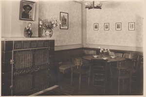 Schwarzweißfotografie. Das Bild zeigt die "Stammtisch-Ecke" der Gaststätte "Barthemis", dem späteren Weinhaus Syré, im Engersport in Bendorf gelegen. Das Gebäude wurde abgerissen und ein Neubau errichtet, in dem sich das Jobcenter der Stadt Bendorf befindet.