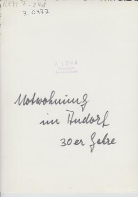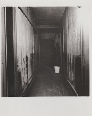 Schwarzweißfotografie. Blick in den Flur einer Notwohnung im Andorf 1930er Jahre.