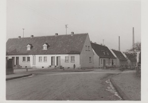 Schwarzweißfotografie. Die Aufnahme zeigt Häuser der Friedrich-Ebert-Siedlung Ecke Karl-Fries-Straße / Sayner Straße, 1941 und im Hintergrund Schornsteine der Firma Lüngen.
