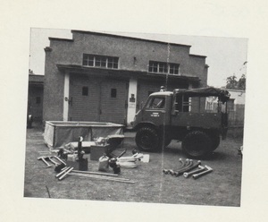 Schwarzweißfotografie. Die Aufnahme zeigt ein Fahrzeug vor den Garagen der Freiwilligen Feuerwehr der Stadt Bendorf in 1960er Jahre. Auf dem Boden vor dem Fahrzeug liegen Teile der Ausrüstung.