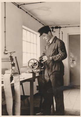 Schwarzweißfotografie. Das Bild zeigt einen Feuerwehrmann der Freiwilligen Feuerwehr Bendorf beim Einbinden der Schlauchkupplungen im Jahre 1955.