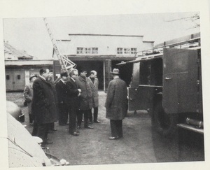 Schwarzweißfotografie, Zeitungsausschnitt. Die Aufnahme zeigt eine Gruppe mit Bürgermeister Karl Schön (1967-1979) bei der Besichtigung des neuen Feuerwehrautos in den 1960er Jahren der Freiwilligen Feuerwehr Bendorf.