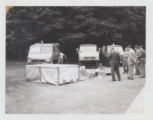 Schwarzweißfotografie. Die Aufnahme zeigt drei Fahrzeuge der Freiwilligen Feuerwehr Bendorf Anfang der 1960er Jahre auf einem Schotterplatz vor Bäumen. Bürgermeister Georg Bauer (1949-1967) begutachtet mit weiteren die auf dem Boden ausgebreitete Ausrüstung.
