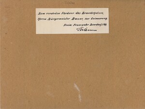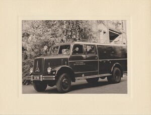 Schwarzweißfotografie. Das Bild zeigt das erste Feuerwehrauto der Stadt Bendorf im Jahre 1952. Auf der Rückseite des Passepartouts steht folgende Widmung: "Dem verehrten Förderer des Brandschutzes, Herrn Bürgermeister Bauer, zur Erinnerung. Freiwillige Feuerwehr Bendorf".