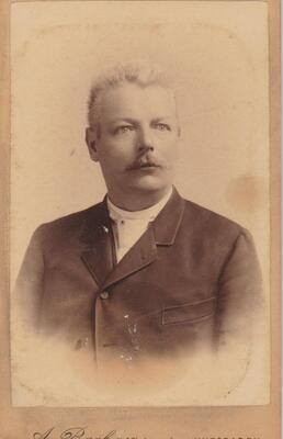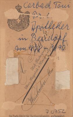 Schwarzweißfotografie, sog. Carte-de-Visite. Portrait von Dr. Toni Karbach, Apotheker in Bendorf von 1878 bis 1890. Fotografiert von "A. Bark, Hof-Photograph Ihrer Majestät d. Königin v. Griechenland, Wiesbaden".