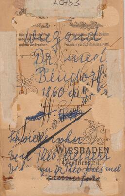 Schwarzweißfotografie, sog. Carte-de-Visite. Portrait von Dr. med. Konrad Wiegand aus den 1860er Jahren, fotografiert von "L. W. Kutz, Wiesbaden". Konrad Wiegand hatte in Marburg und Berlin studiert, bevor er nach Abschluss seiner Promotion 1861 als Assistenzarzt in Heil- und Pflegeanstalten arbeitete. 1863 ließ er sich als praktischer Arzt zuerst in Wiesbaden und dann als Badearzt in Bendorf nieder. Im Oktober 1863 heiratete er Ida Neizert, Tochter des Fabrikanten Theodor Neizert. Theodor Neizert hatte zuerst eine Kalk- und Ziegelbrennerei aufgebaut und stellt ab 1861 feuerfeste Steine (Schamottsteine) her. Aus dieser Fabrik gingen später die späteren Rheinischen Schamott- und Dinaswerke hervor. Dr. Konrad Wiegand war in den Jahren 1869-1874 für die Jacoby´sche Heil- und Pflegeanstalt in Sayn tätig. Sein ältester Sohn ist der bekannte Archäologe Theodor Wiegand.
