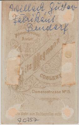 Schwarzweißfotografie, sog. Carte-de-Visite. Portrait von Gustav Willbach, Fabrikant in Bendorf um 1880. Fotografier von "Fritz Hegmann Coblenz".
