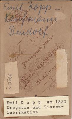Schwarzweißfotografie, sog. Carte-de-Visite. Portrait von Emil Kopp, einem Kaufmann in Bendorf um 1885. Er besaß eine Drogerie- und Tintenfabrik. Fotografiert von "Felix Heinze, Braunschweig"