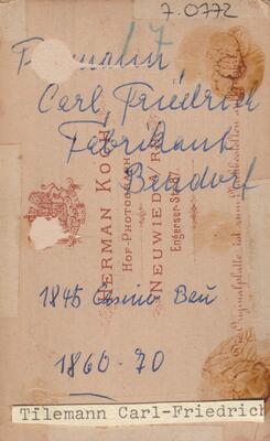 Schwarzweißfotografie, sog. Carte-de-Visite. Das Portrait zeigt Carl-Friedrich Tilemann, Mitbesitzer der 1776 gegründeten Colonialwaren-Großhandlung und der 1806 im Siegburger Hof um 1850 in der ehemaligen Oberhütte gegründeten Chichorienfabriken. Fotografiert von "Hermann Koch Hofphotograph / Neuwied a/Rh. / Engerser-Str. 87."