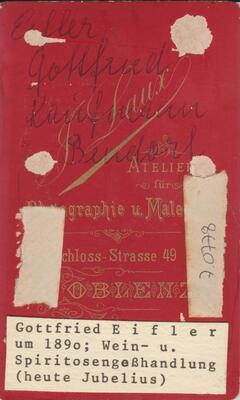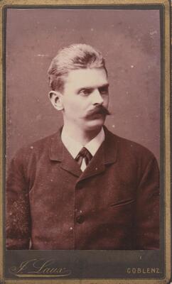 Schwarzweißfotografie, sog. Carte-de-Visite. Portrait von Gottfried Eiffler um 1890, Bendorfer Geschäftsmann. Er führte eine Wein- und Spiritosengroßhandlung (später Jubelius). Fotograf: "J. Laux Coblenz"