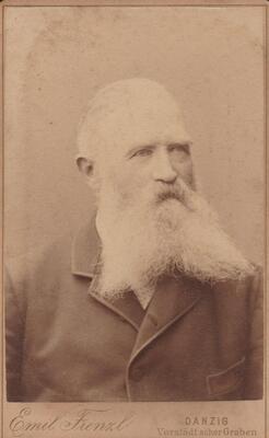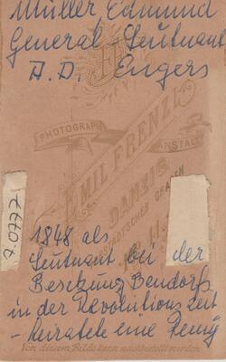Schwarzweißfotografie, sog. Carte-de-Visite. Portrait von General-Leutnant a. D. Edmund Müller aus Engers. Er war 1848 als Leutnant bei der Besetzung Bendorfs dabei. Seine Gemahlin war eine geborene Remy. Fotograf "Emil Frenzl" "Danzig / Vorstädt´scher Graben"