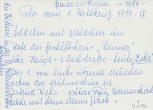Schwarzweißfotografie. Das Bild zeigt amerikanische Soldaten mit Mädchen im Hof des Geschäftshauses "Renner" (Ecke Haupt- und Bachstrasse). Das erste von links sitzende Mädchen neben der Nähmaschine ist Gertrud Kahn, spätere Frau Wermerskirch, welche mit ihrem Mann Jakob die Bäckerei in der Unteren Vallendarer Strasse betrieb.