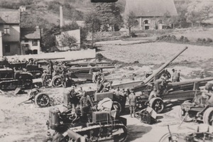 Schwarzweißfotografie. Das Bild zeigt eine amerikanische Artilleriestellung am "Gasthaus Oberhof" in der Mühlenstrasse in Bendorf. Im Hintergrund der Holzkohlenschuppen der 1804 gegründeten Remy'schen Oberen Hütte am Fuße des Goldbergs.