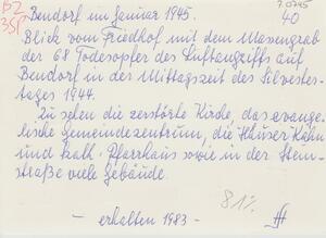 Schwarzweißfotografie. Das Bild zeigt Bendorf im Januar 1945 nach dem Luftangriff bedeckt von einer Schneeschicht. Blick vom Friedhof mit dem Massengrab der 68 Todesopfer des Luftangriffes auf Bendorf in der Mittagszeit des Neujahrstages 1945. Zu sehen sind die teilweise zerstörte Medardus-Kirche, das evangelische Gemeindezentrum, die Häuser Kahn und das katholische Pfarrhaus sowie einige Gebäude in der Steinstrasse.