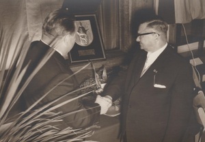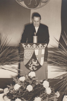 Schwarzweißfotografie. Das Foto zeigt Georg Bauer, während seiner Rede anlässlich seiner Ernennung zum Ehrenbürger der Stadt Bendorf am 5. Februar 1969 im großen Sitzungssaal im Rathaus. Georg Bauer war Bürgermeister der Stadt Bendorf vom 1. April 1949 bis zum 30. November 1967. 1967 überträgt er die Verantwortung für die Geschicke "seiner" Stadt Bendorf seinem Nachfolger Karl Schön.