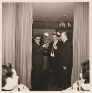 Schwarzweißfotografie. Das Bild zeigt den Bürgermeister der Stadt Bendorf, Georg Bauer Mitte der 1960er Jahre. Mit ihm auf dem Foto zu sehen sind Karl Schön (1. Beigeordneter) und Heidrich (Parteivorsitzender).