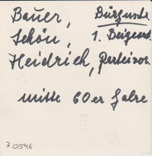 Schwarzweißfotografie. Das Bild zeigt den Bürgermeister der Stadt Bendorf, Georg Bauer Mitte der 1960er Jahre. Mit ihm auf dem Foto zu sehen sind Karl Schön (1. Beigeordneter) und Heidrich (Parteivorsitzender).