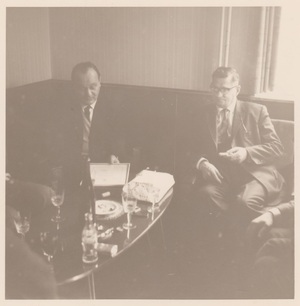 Schwarzweißfotografie. Das Bild zeigt den Bürgermeister der Stadt Bendorf, Georg Bauer (1949-1967) gemeinsam mit Theo Klostermann Mitte der 1960er Jahre.