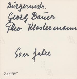 Schwarzweißfotografie. Das Bild zeigt den Bürgermeister der Stadt Bendorf, Georg Bauer (1949-1967) gemeinsam mit Theo Klostermann Mitte der 1960er Jahre.