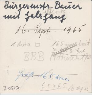 Schwarzweißfotografie. Das Bild zeigt den Bürgermeister der Stadt Bendorf, Georg Bauer zusammen mit Jahrgangsmitgliedern am 16. September 1965 bei einem Ausflug.